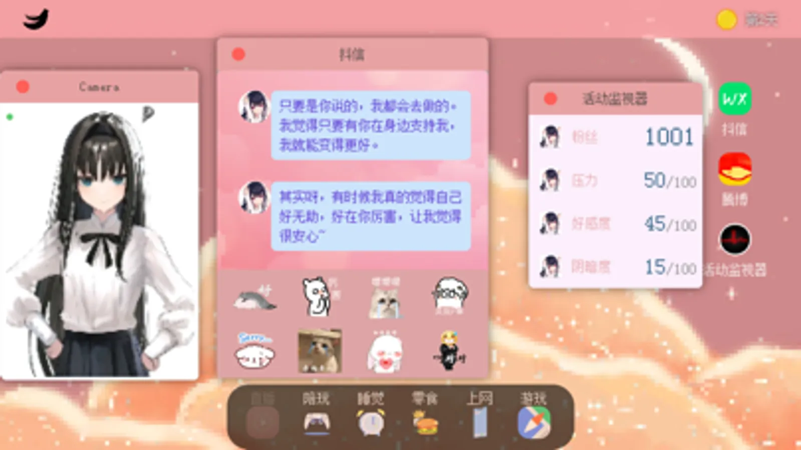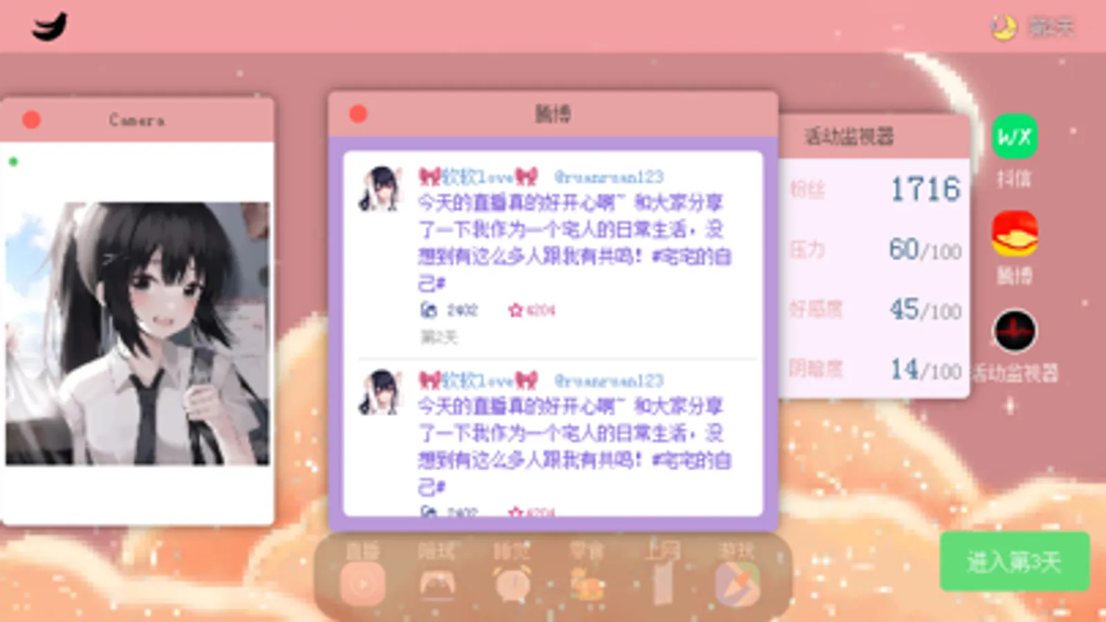 游戏中,每一个决策都会影响软软的职业和个人生活走向,而你的目标是帮助她克服困难,实现百万粉丝的梦想。