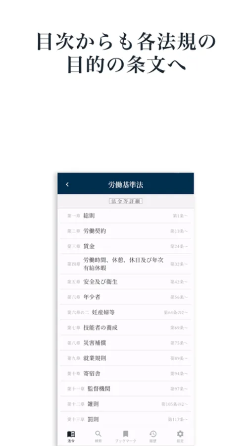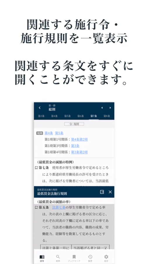 目的の条文が決まっている場合には、番号を指定してすぐに表示できます。また、施行令・施行規則がある場合には、その条項に対する言及がある条項を一覧として提示し、すぐに下位の法規にアクセスできるようにしています。