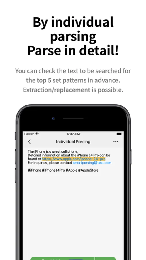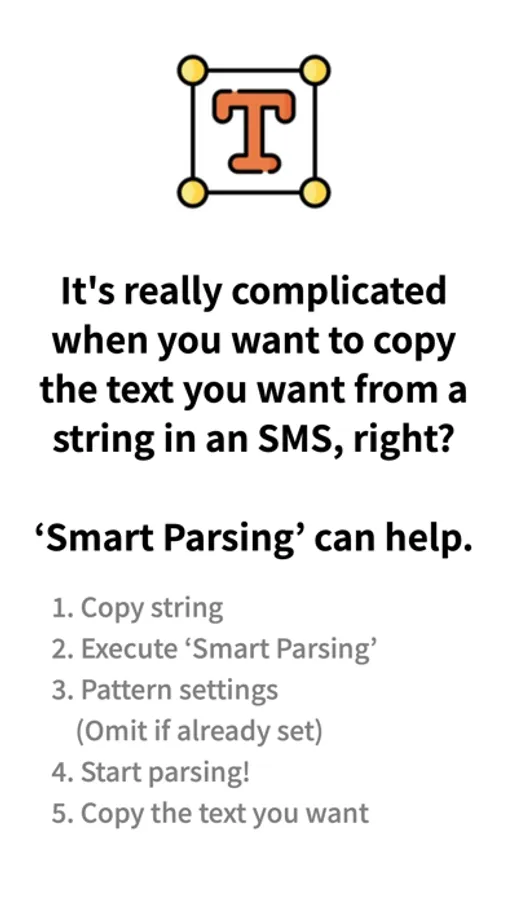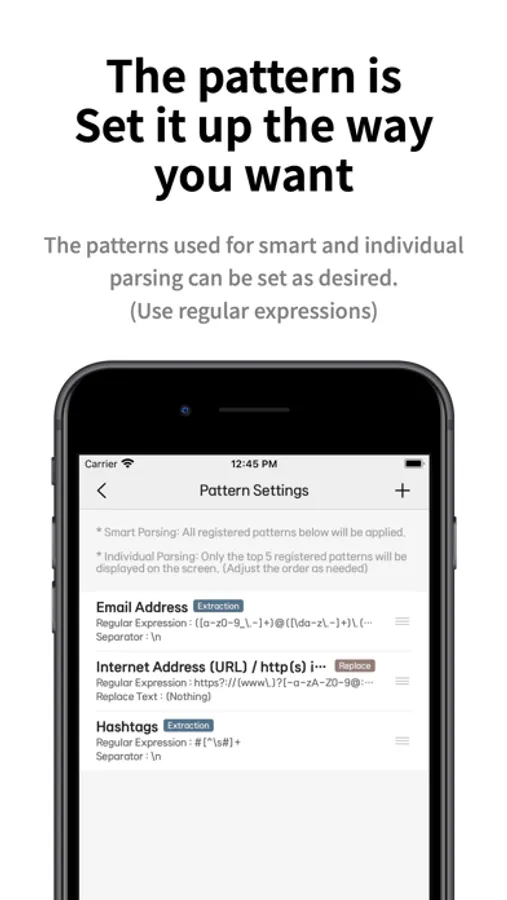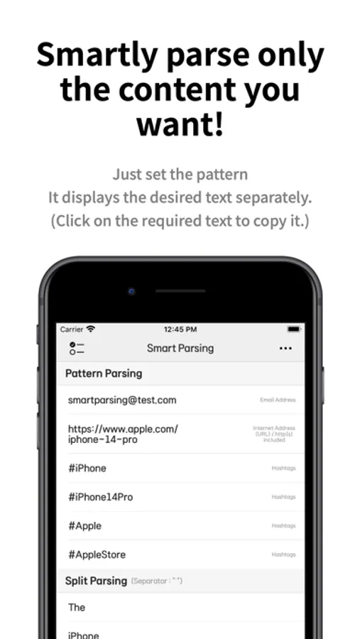 'Smart Parsing' is a powerful app that allows you to easily extract/replace/copy desired items in strings.1. Smart Parsing Function * Displays text copied to the clipboard as a list of results matching the patterns registered in the app.