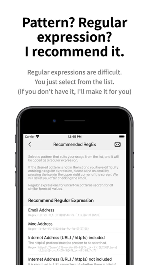 Q: There is no desired pattern in the regular expression recommendation service?A: If you contact us within the app (regular expression recommendation - top right - email icon) or send us your pattern information to the email below, we will help you create a regular expression.[ App Permissions ]* Essential Permissions