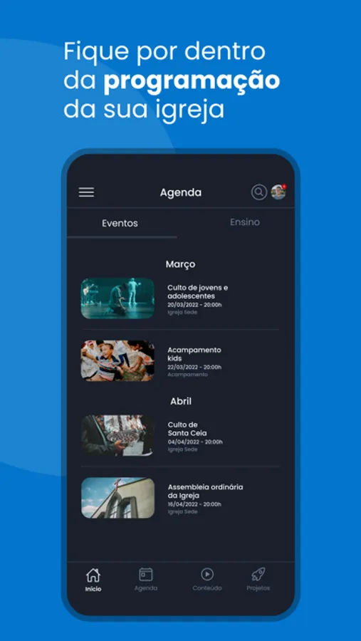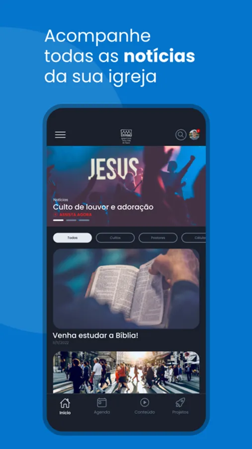Recursos disponíveis no Aplicativo: Notícias, Agenda da igreja, Eventos, Conteúdos, Projetos, Transmissão ao Vivo e Módulo Ensino.