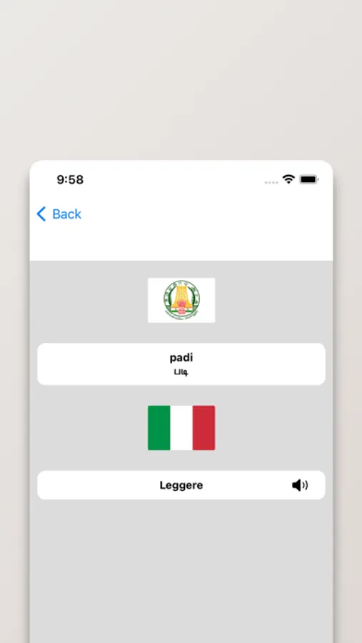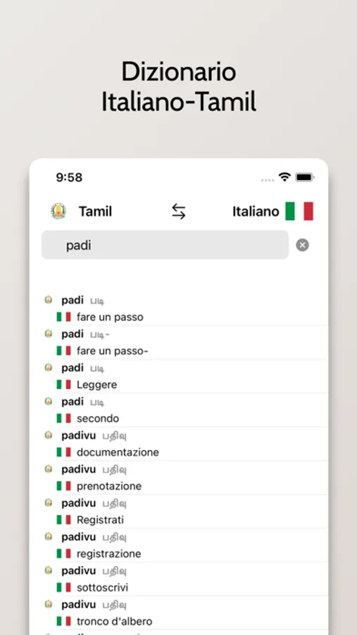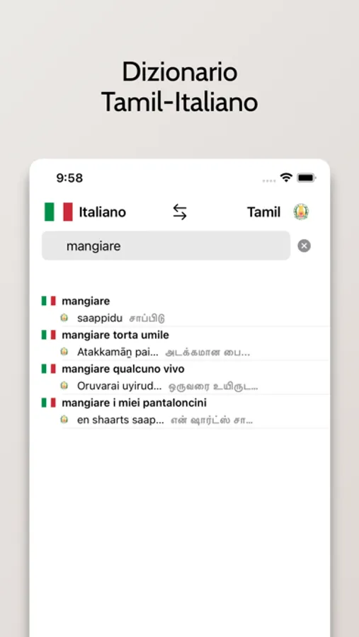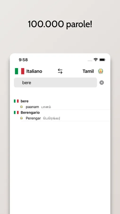 - Possibilità di cercare a partire da parole in Italiano o Tamil