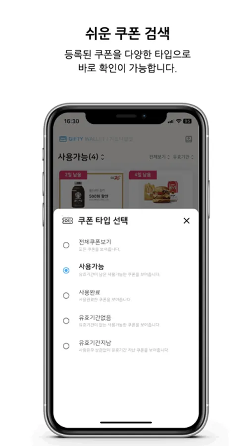 등록한 쿠폰을 타입별(전체보기, 사용가능, 사용완료, 유효기간없음, 유효기간없음)과 등록한 브랜드별로 쉽게 검색 가능합니다.