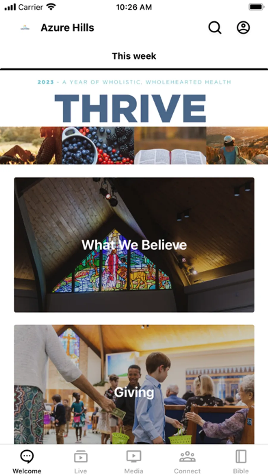 The Azure Hills Church app will help you stay connected with the day-to-day life of our church. With this app you can: watch or listen to past messages; stay up to date with push notifications; share your favorite messages via Facebook, Instagram or email; and download messages for offline listening.