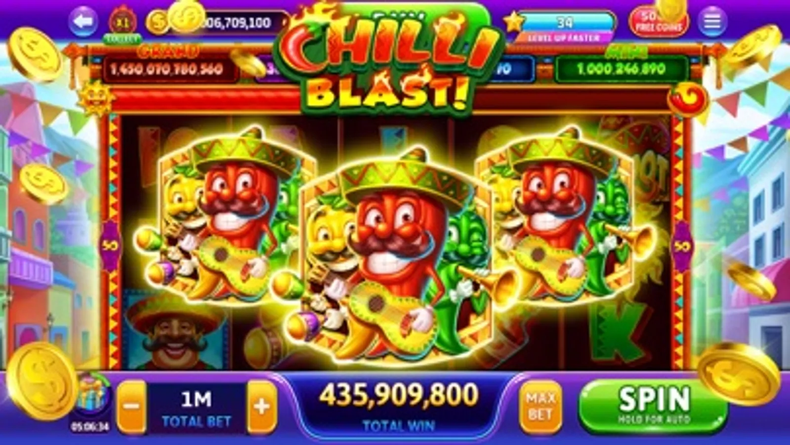 You can find free coins all over the Hot Chilli Slots Casino! Big Express runs every 15 minutes, Mega Express every 1 hour! Daily bonuses and roulette bonuses, huge coins for daily quest challenges and weekly lucky treasures! More coins waiting for you to find! The spin and jackpot never stop!