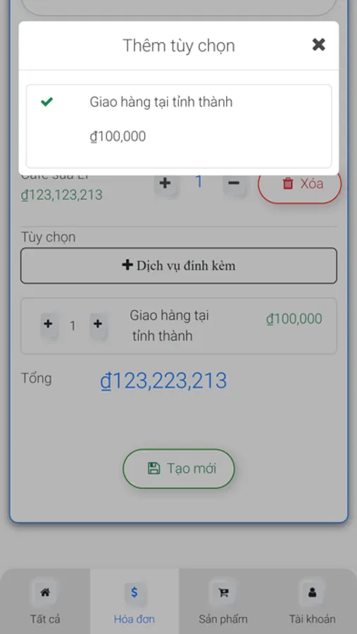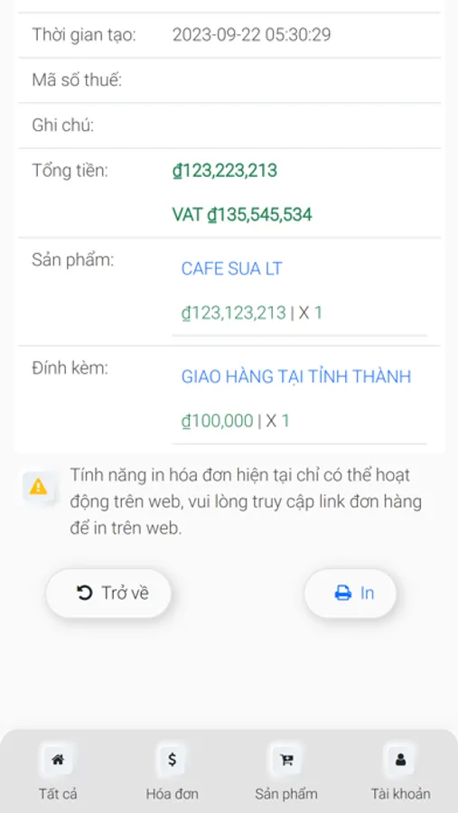 - Lên đơn hàng, kèm sản phẩm, dịch vụ, phí đính kèm theo trong hóa đơn. Có thể in hóa đơn trên web. khách hàng cũng có thể truy xuất hóa đơn dựa trên link đơn hàng có trên hóa đơn đã xuất bản.