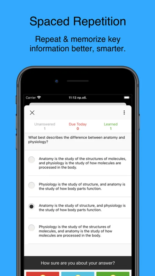 - Spaced Repetition Quiz: reinforce knowledge, driven by a smart learning algorithm