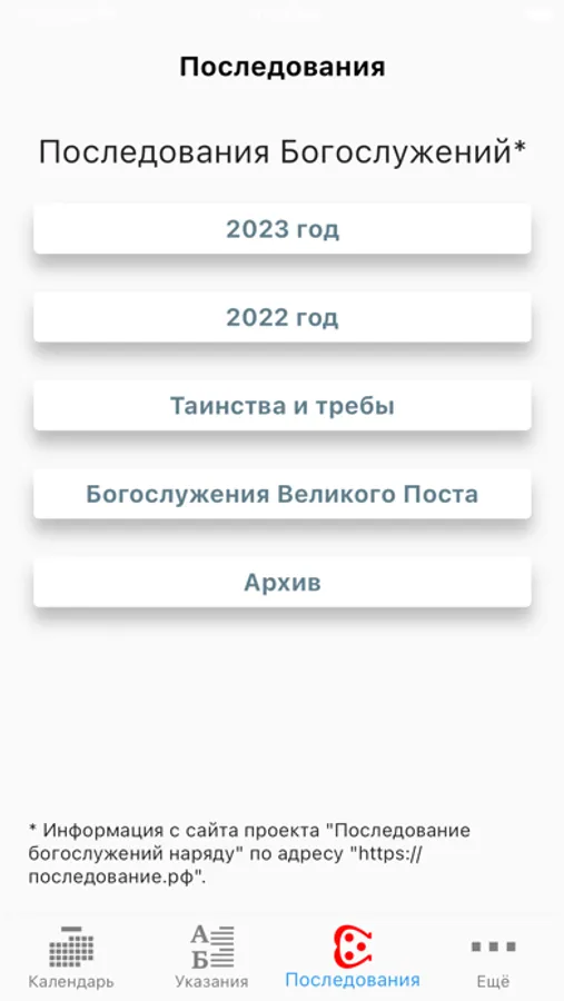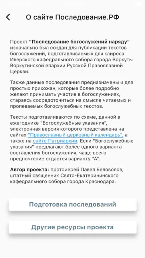 1. Последования Богослужений на сайте проекта "Последование богослужений наряду" по адресу "https://последование.рф", подготовленные для клироса Иверского кафедрального собора города Воркуты Воркутинской епархии Русской Православной Церкви.