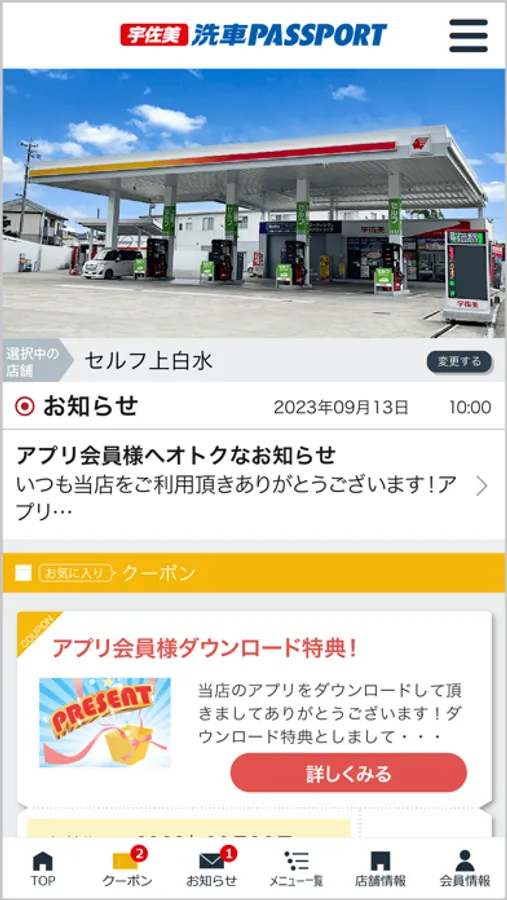 当社の公式アプリ「宇佐美洗車PASSPORT」ではアプリで洗車サービスのご利用が可能の他、当店で利用いただけるお得なクーポンや各種メニューの割引情報を配信しております。