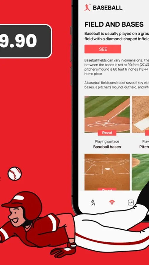 Greetings to all baseball fans and players! Boost your baseball IQ and immerse yourself in the world of America's favorite pastime. Open the playbook and learn the ins and outs of baseball with our handy guides. From the fundamental rules that define the game to the intricate details of baseball field anatomy, you'll become a true baseball connoisseur. Get analytical with detailed team statistics that fuel discussion among analysts, coaches, and other fans. Stay up-to-date with the latest data and trends that make every matchup more interesting. Enhance your experience with engaging lessons that reveal the strategies, tactics, and evolutionary history of baseball. After each lesson, test your new knowledge with an interactive quiz that will test your understanding of the game. For players who live for the action, a built-in timer ensures accurate gameplay on the field. Easily track innings, timeouts, and more so you can focus on making every second count. Become a baseball maestro, the app will turn you into a baseball virtuoso!