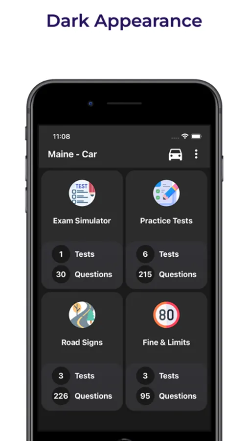 The app includes a Mock Test with random questions and a Practice Test with a variety of Maine DMV Permit Test practice questions. These questions are based on the Maine Bureau of Motor Vehicles handbook.