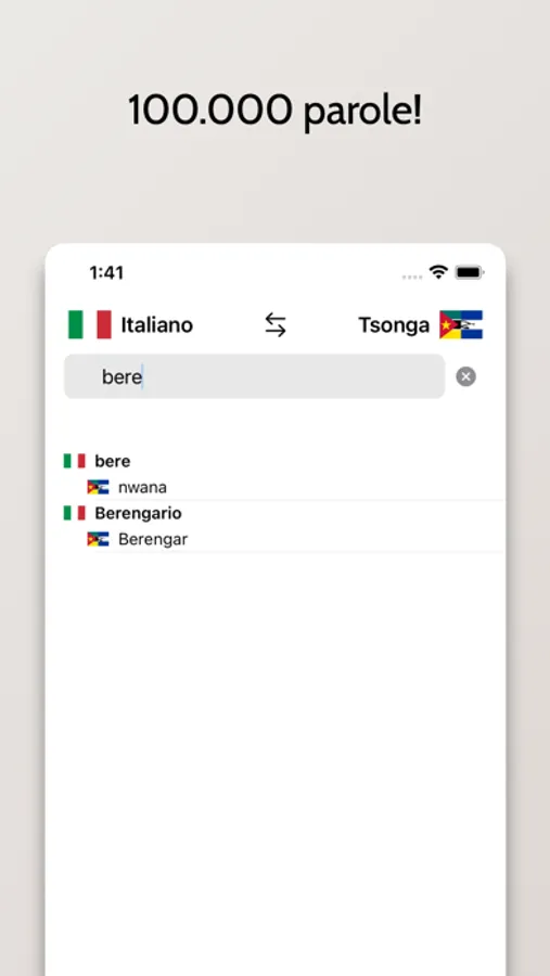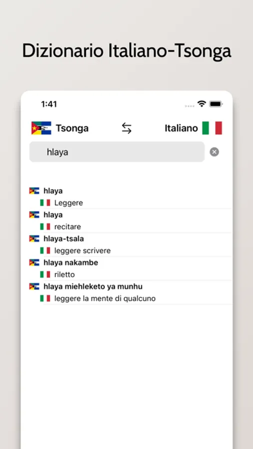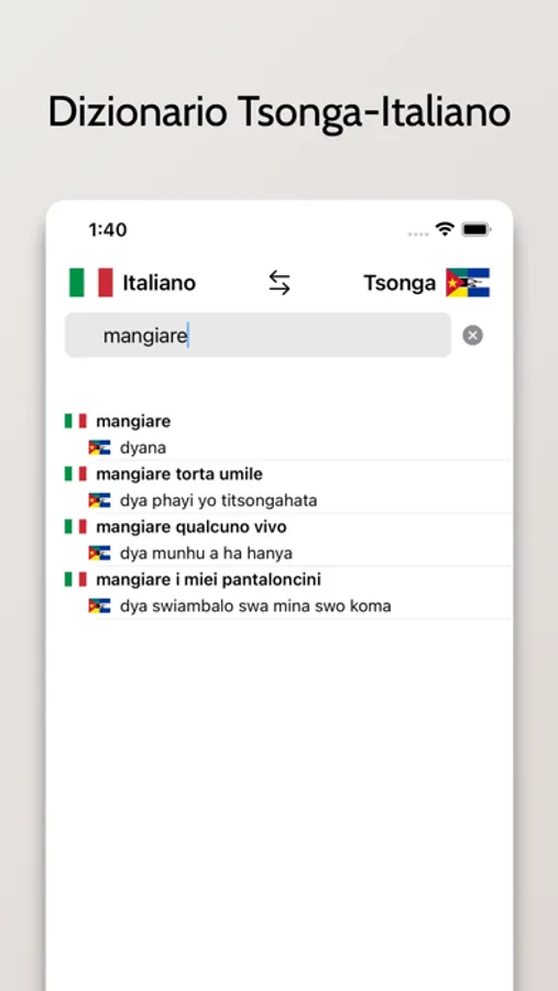 - Possibilità di cercare a partire da parole in Italiano o Tsonga