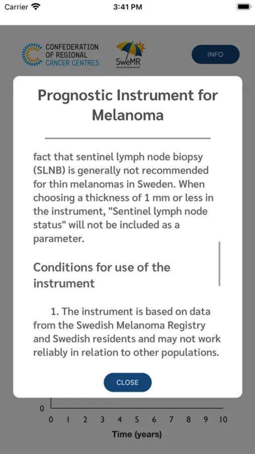 The analyses that form the basis of the instrument are performed on separate models for thin melanomas (≤ 1mm) and thicker melanomas (> 1mm) due to the fact that sentinel lymph node biopsy (SLNB) is generally not recommended for thin melanomas in Sweden. When choosing a thickness of 1 mm or less in the instrument, "Sentinel lymph node status" will not be included as a parameter.