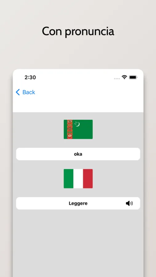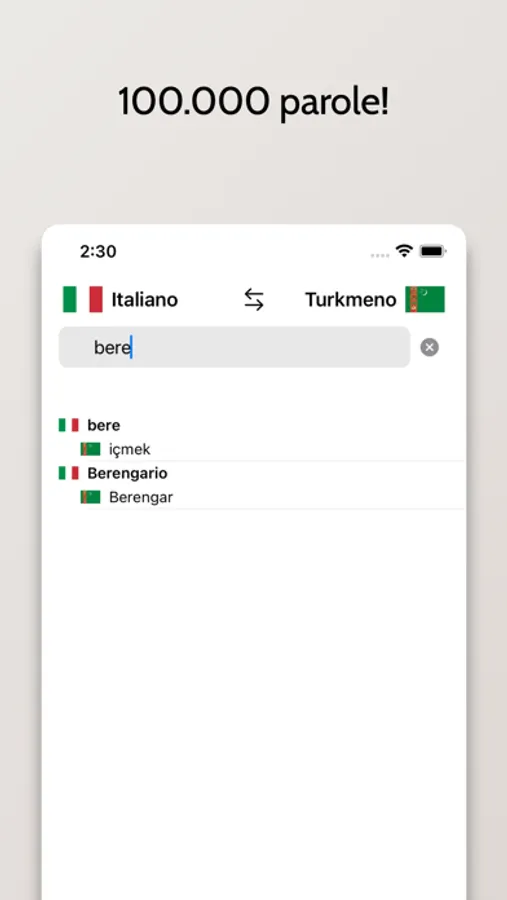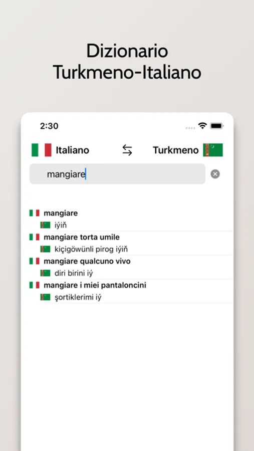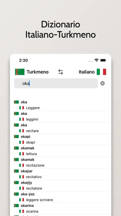 - Possibilità di cercare a partire da parole in Italiano o Turkmeno