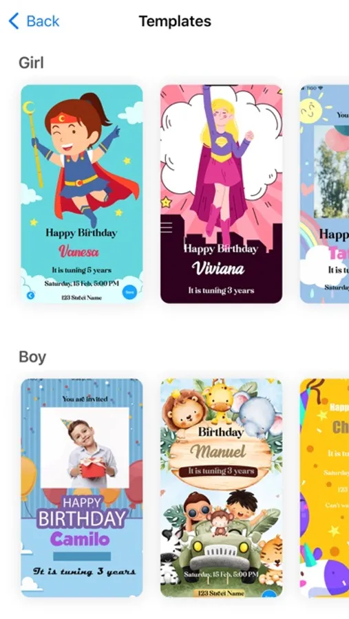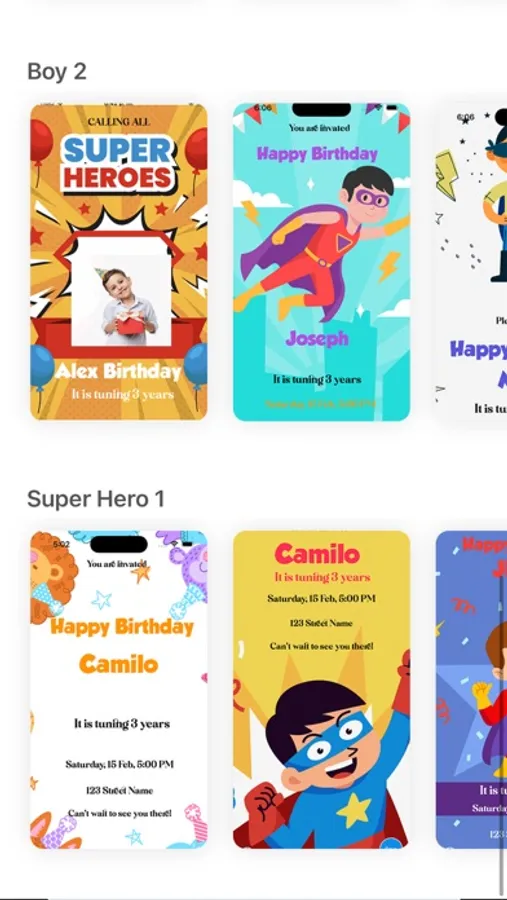 Diverse Template Categories: Our app offers a vast selection of invitation templates categorized to suit every taste. Choose from categories like Girls, Boys, Super Heroes, Princess, Unicorns, and more. No matter the theme of your party, you'll find the perfect template to match.