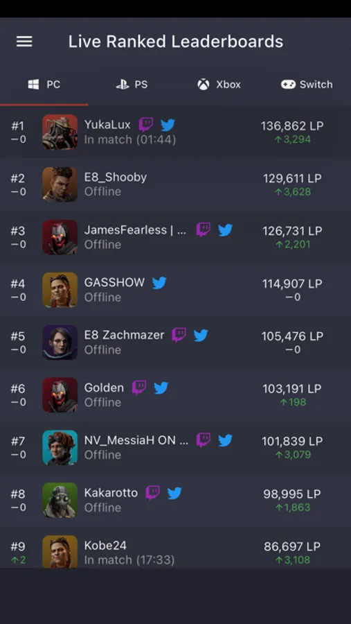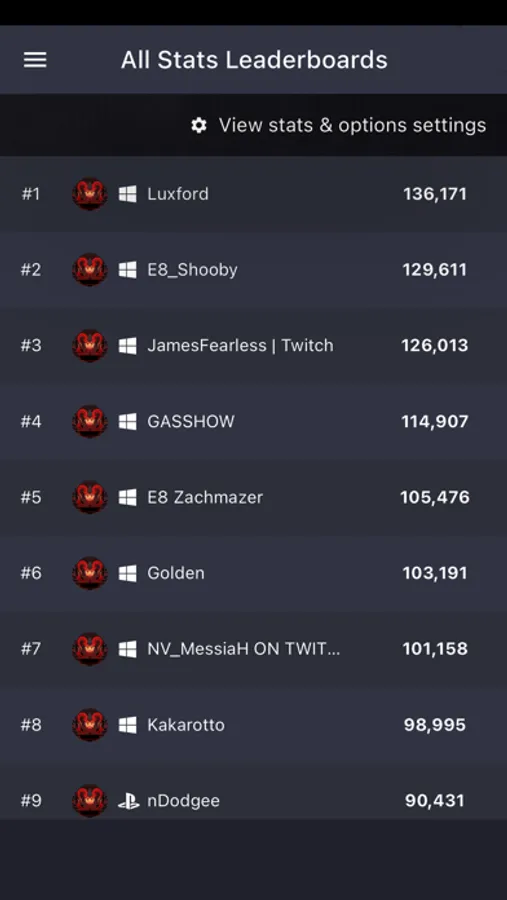 A wide range of leaderboards are available, covering all stats in game, on top of live ranked leaderboards for each platform.