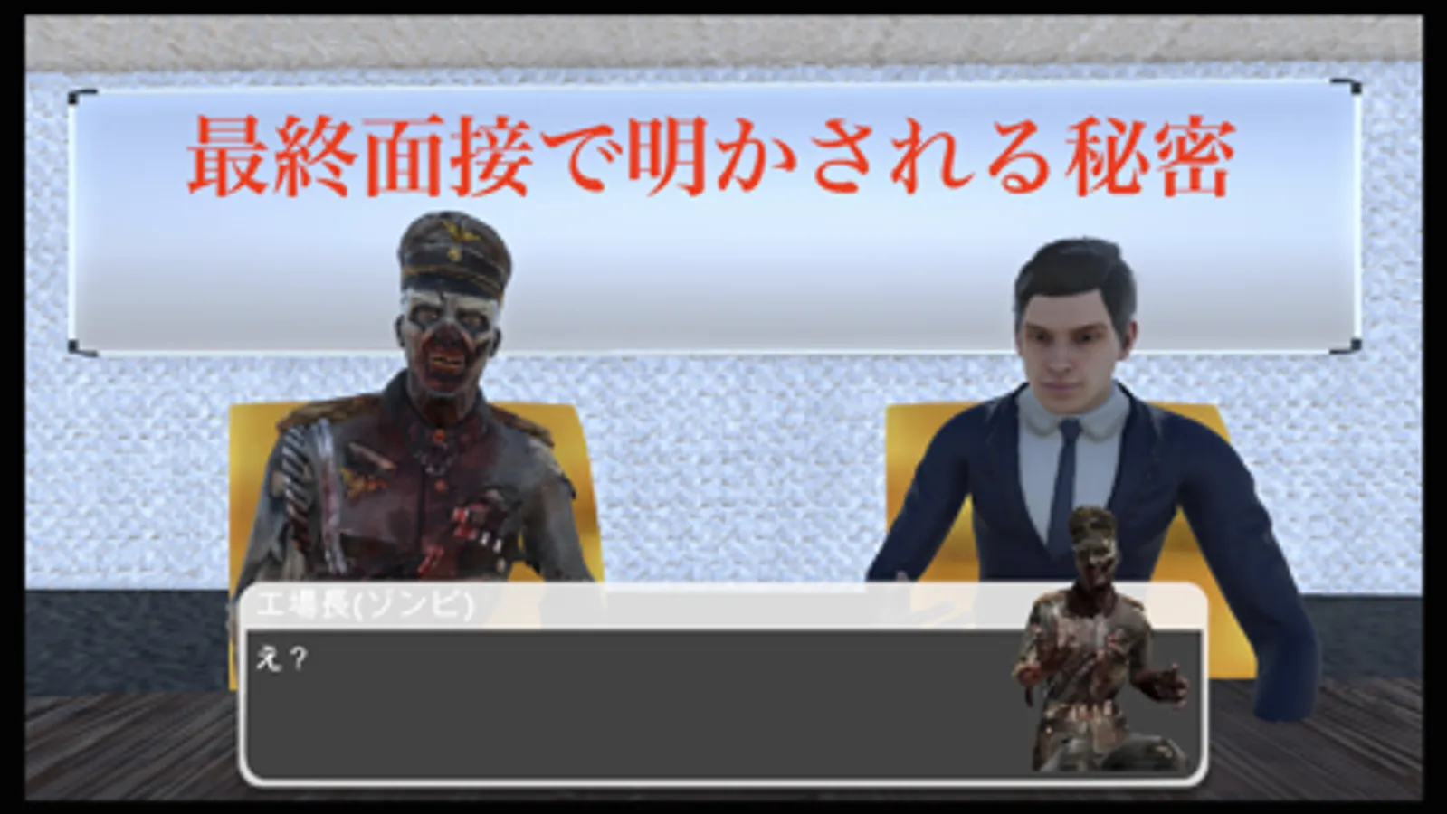 Players who are big fans of Zombie Manufactory's zombie-inspired events will face an interview to join the company. The interviewers are the human resources manager (human) and the factory manager (a zombie with intelligence).