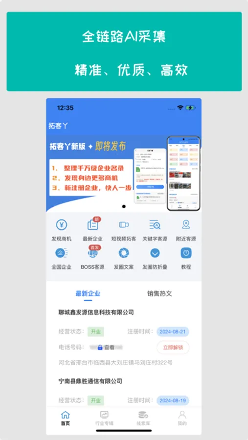 拓客丫app致力于大数据采集及分析,集成地图中商家客源,附近商家客源。整合市面上最具有商业价值的公开合法数据,各行业名录数据,新注册工商登记信息及商机线索。通过智能分析及自动化技术,帮助销售人员节省宝贵时间,拓展精准客源,提高成交率。