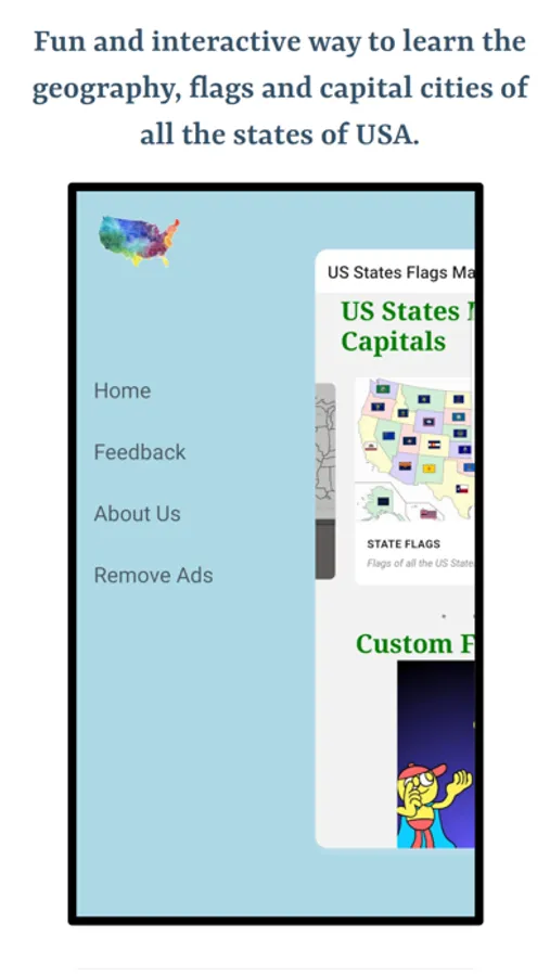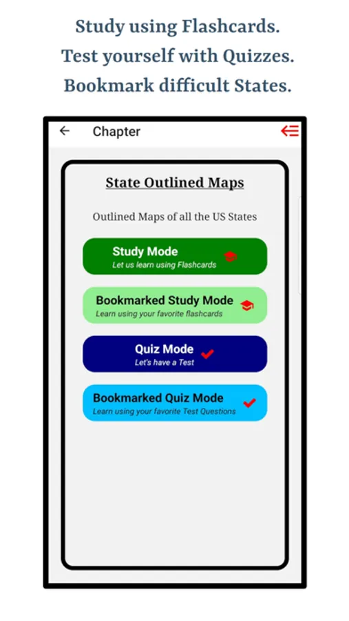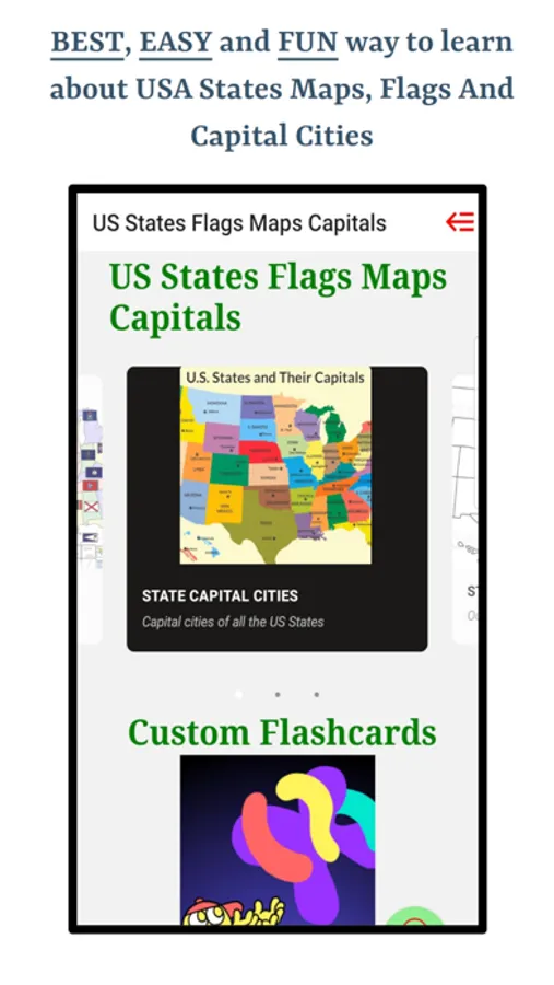 There are 50 States in the United States of America. This app will help you memorize the flags, maps and the capital cities of these states. For the sake of user engagement and arouse their curiosity, this app is created in the form of flashcards. For the flags section, states' flags will be shown on one side of the flashcard and states' names will be shown on the other side of flashcard. Similarly for capital cities section and maps section, state's name and map are shown at the front of the flashcards and the capital city and state's name is shown on the other side of the flashcard respectively. Following are the key top features of the app and we do our best to keep adding more and more features.