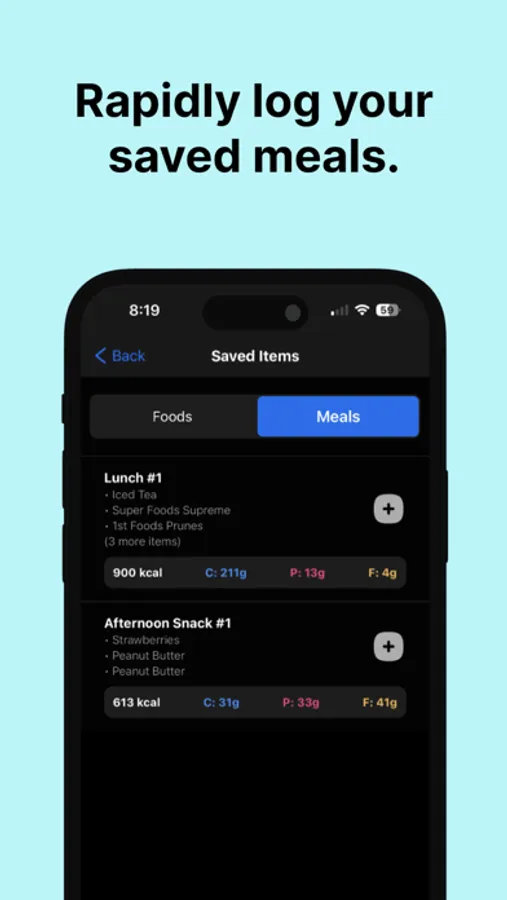 - Saved Foods + Meals: Save your favorite foods and create re-usable meals to more conveniently track your calories.