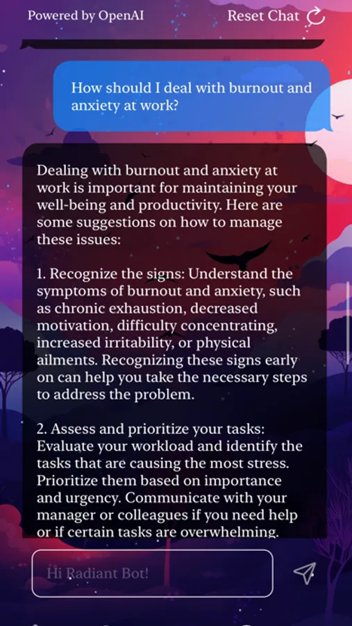 Talk to a therapist-based AI whenever you need to. The Radiant chat bot is available 24/7 to help you with whatever you're going through.