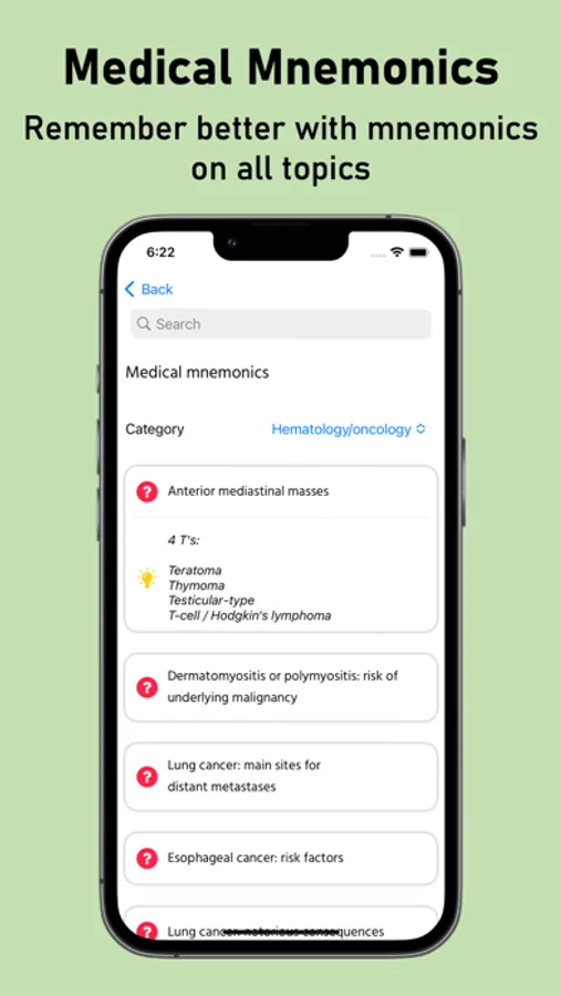 ** Huge collection of medical terminologies and mnemonics to remember and prepare for exams. Search and read terms and mnemonics from all the medical topics. If you don't find it the list, don't worry, ask your in-app AI study buddy who can answer all your questions anytime and anywhere you need.