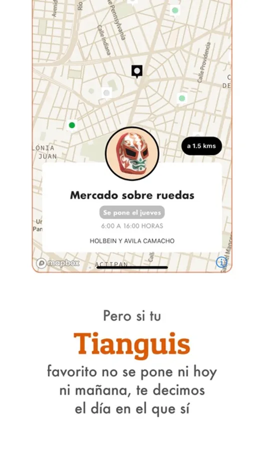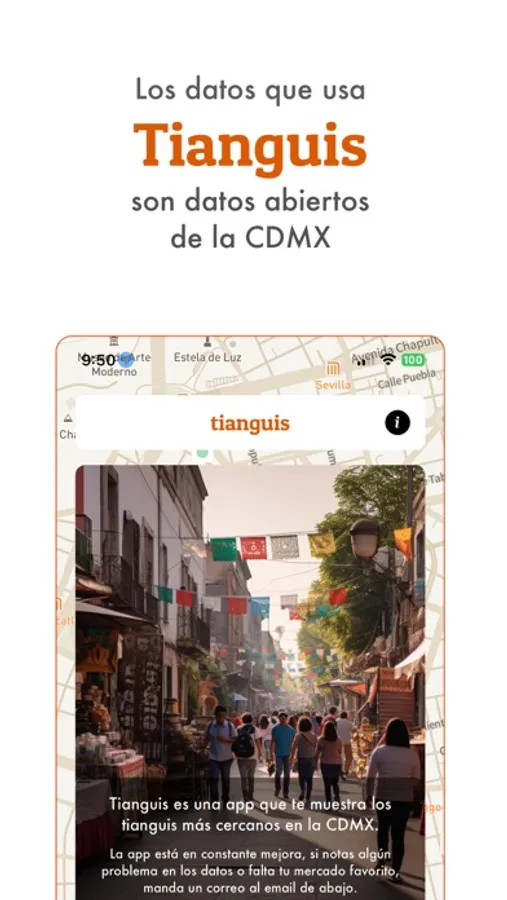 En esta app puedes visualizar en el mapa de la CDMX los Tianguis que se ponen en la ciudad a lo largo de la semana. Cada uno de ellos aparece asociado a un marcador con colores diferentes dependiendo si está abierto no en el día actual. Además, si tienes servicios de localización activados te mostramos la distancia a la que se encuentra respecto a tu ubicación actual. Esta app usa los datos abiertos de la CDMX.