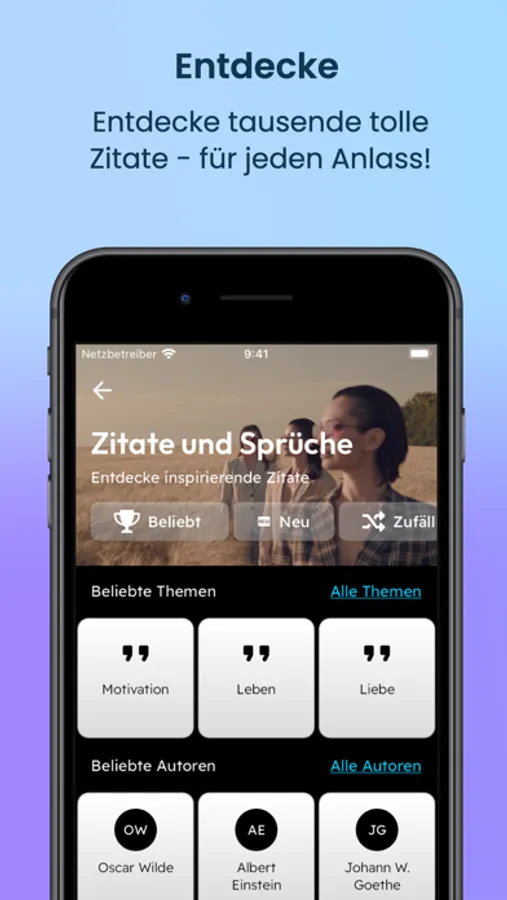 Entdecke unzählige Zitate von berühmten Persönlichkeiten wie Albert Einstein, Wolfgang Goethe oder Oscar Wilde, die dich inspirieren. Filtere die Zitate nach Themen wie Motivation, Liebe oder Leben.