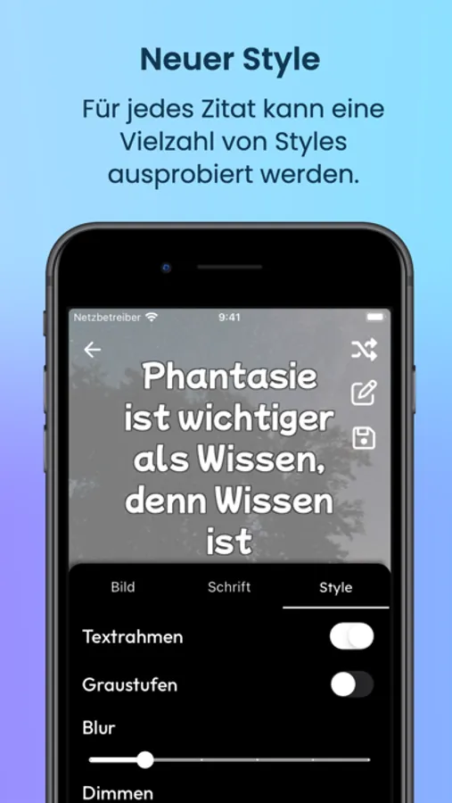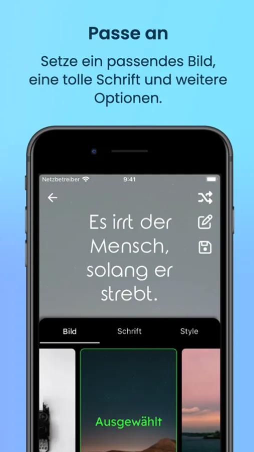 Passe an: Jedes Zitat wird mit einem passenden Bild und Style angezeigt. Wenn dir das nicht gefällt, können für jedes Zitat weitere Styles generiert werden. Bild, Schrift und Stil können aber auch individuell angepasst werden.