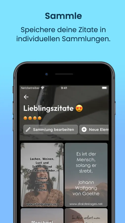 Sammeln: Organisiere deine Lieblingszitate in Sammlungen. Sammlungen können selbst erstellt werden und ermöglichen das Speichern deiner Zitate im gewählten Look.