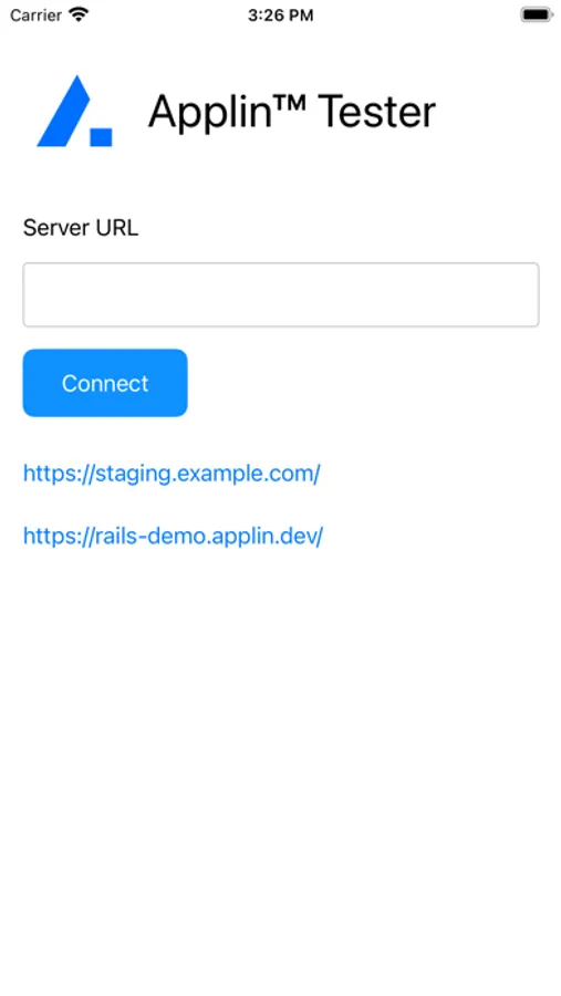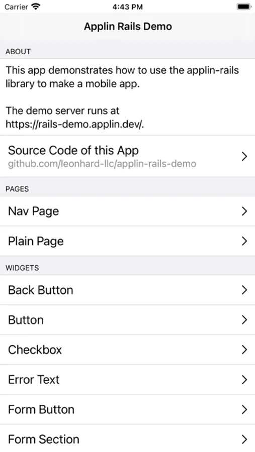 Applin Tester embeds the Applin client library for iOS and connects to any Applin server. As you develop your app server, you can use Applin Tester to connect to your server and display your app's pages. Applin Tester also displays Applin demo apps, with links to their source code.