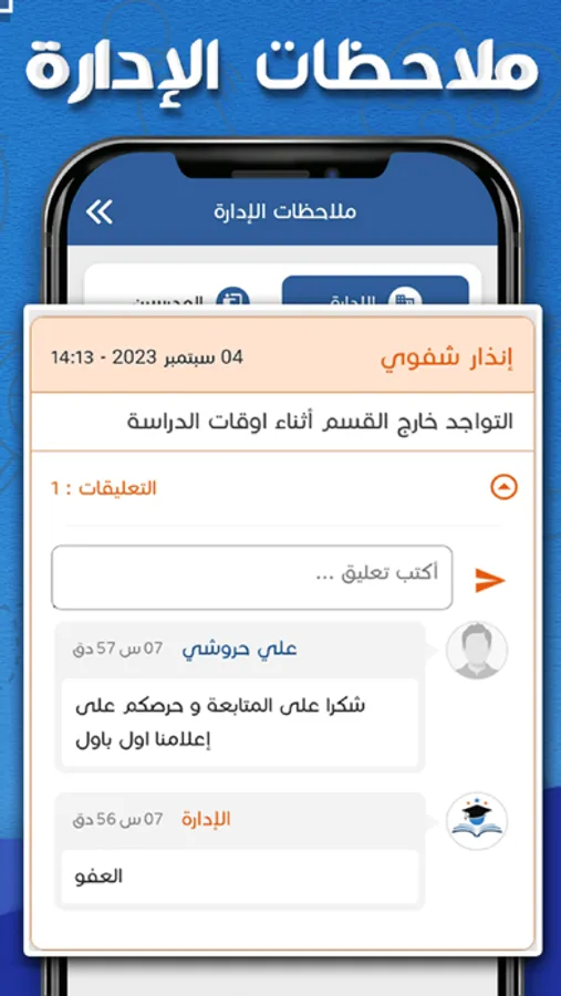 - تواصل دائم بين الطالب و المعهد: تمكّن الإدارة و المدرّسين من إرسال الملاحظات المتعلقة بالنشاط الدراسي للحصول على كفاءة أفضل وتوفير الوقت.