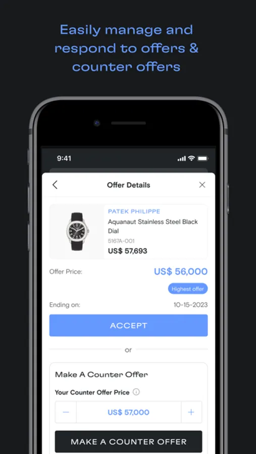 Sell watches at your fingertips. Manage your active listings and negotiate offers with buyers with just a few taps.