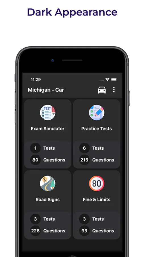 The app includes a Mock Test with random questions and a Practice Test with a variety of Michigan DMV Permit Test practice questions. These questions are based on the Michigan Secretary of State handbook.