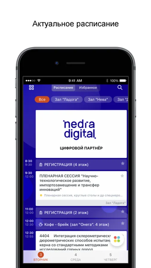 - Составить персональное расписание, добавив в избранное интересующие вас мероприятия программы;