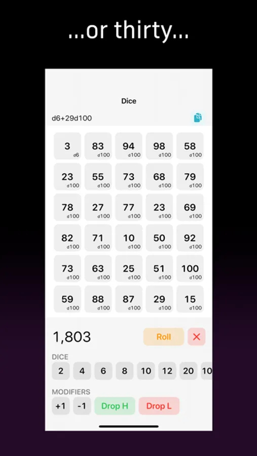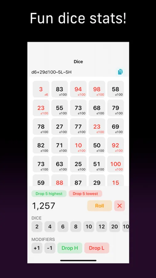 Simple-to-use dice simulator. Flip a coin or roll 100 d20s. Also supports more advanced operations such as dropping the highest or lowest score.