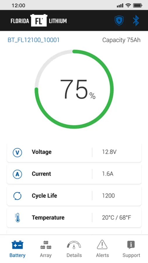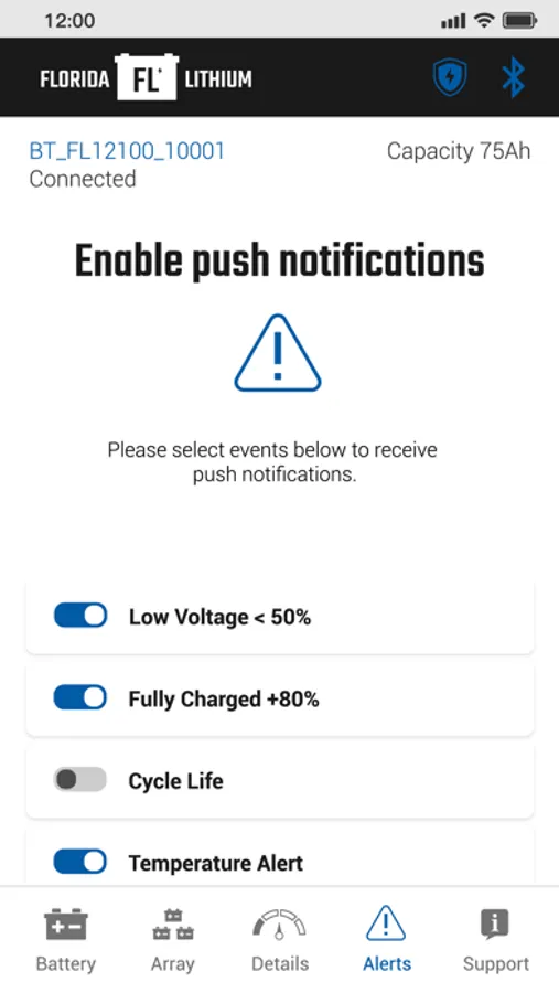 The Florida Lithium battery monitor app provides real-time battery diagnostics, information, and updates about the status of your lithium batteries (which can be configured in a series, or viewed as individual batteries). The app interface allows you to enable push notifications and alerts relative to your battery’s state of charge, voltage level, current, temperature, and individual cell voltages.