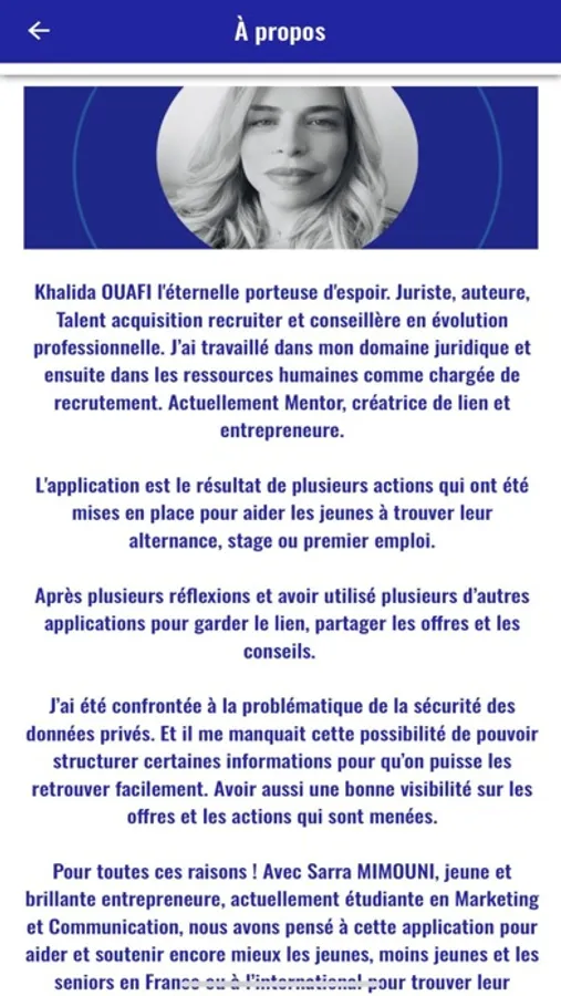 Pour toutes ces raisons ! Avec Sarra MIMOUNI, jeune et brillante entrepreneure, actuellement étudiante en Marketing et Communication, nous avons pensé à cette application pour aider et soutenir encore mieux les jeunes, moins jeunes et les seniors en France ou à l’international pour trouver leur bonheur.