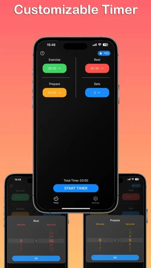 • Customizable Timers: Adjust the duration of the Prepare, Start, and Rest timers to fit your gym routine.