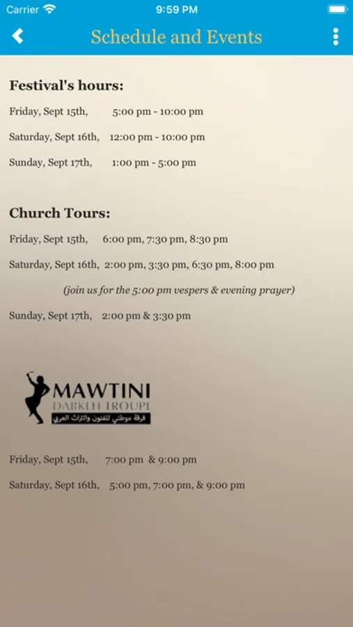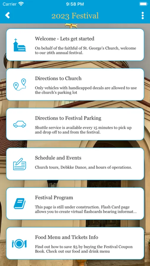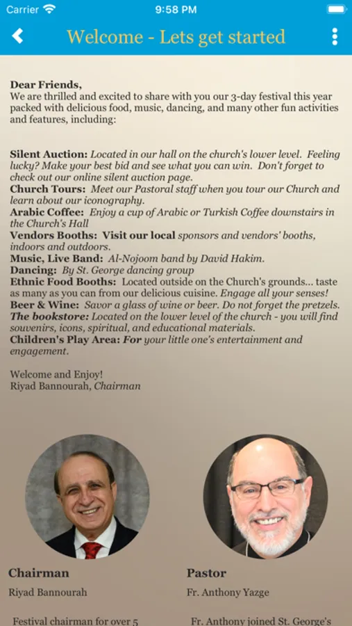 This application will help you gain access to St. George Orthodox Christian Church’s events, especially the church’s map, the annual Middle Eastern Festival, its food, bakery shop, and vendor booths locations. It will also give you festival parking locations, and information about our main events’ sponsors. This app will list the live entertainment schedule and times as well.