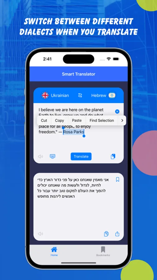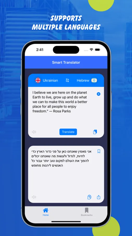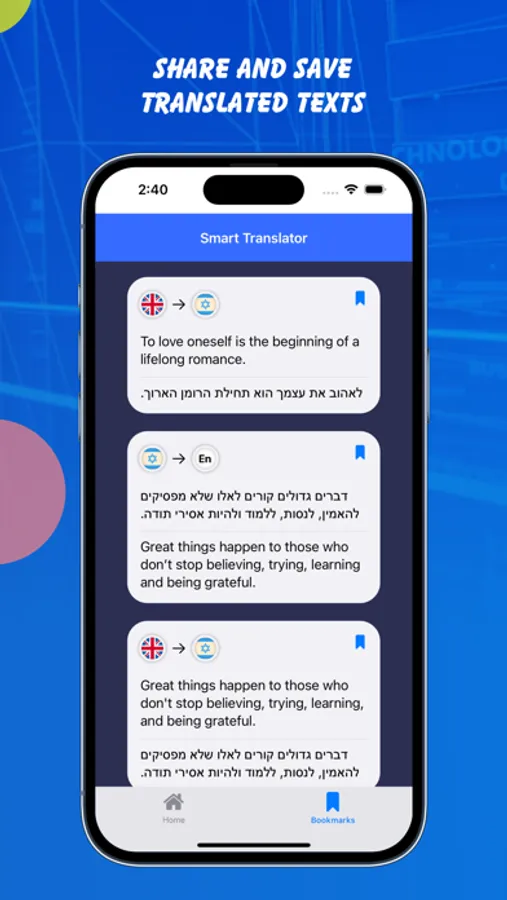 Smart Translator is your all-in-one iOS solution for instant text translation. With an intuitive user interface, it allows you to effortlessly translate text between languages, making it perfect for travel, international communication, and language exploration. You can also bookmark your most-used translations for quick access, ensuring you never lose a valuable phrase. Whether online or offline, Smart Translator guarantees accurate and reliable translations, prioritizing your data privacy and security. Say goodbye to language barriers and hello to smooth multilingual conversations with Smart Translator on your iOS device.
