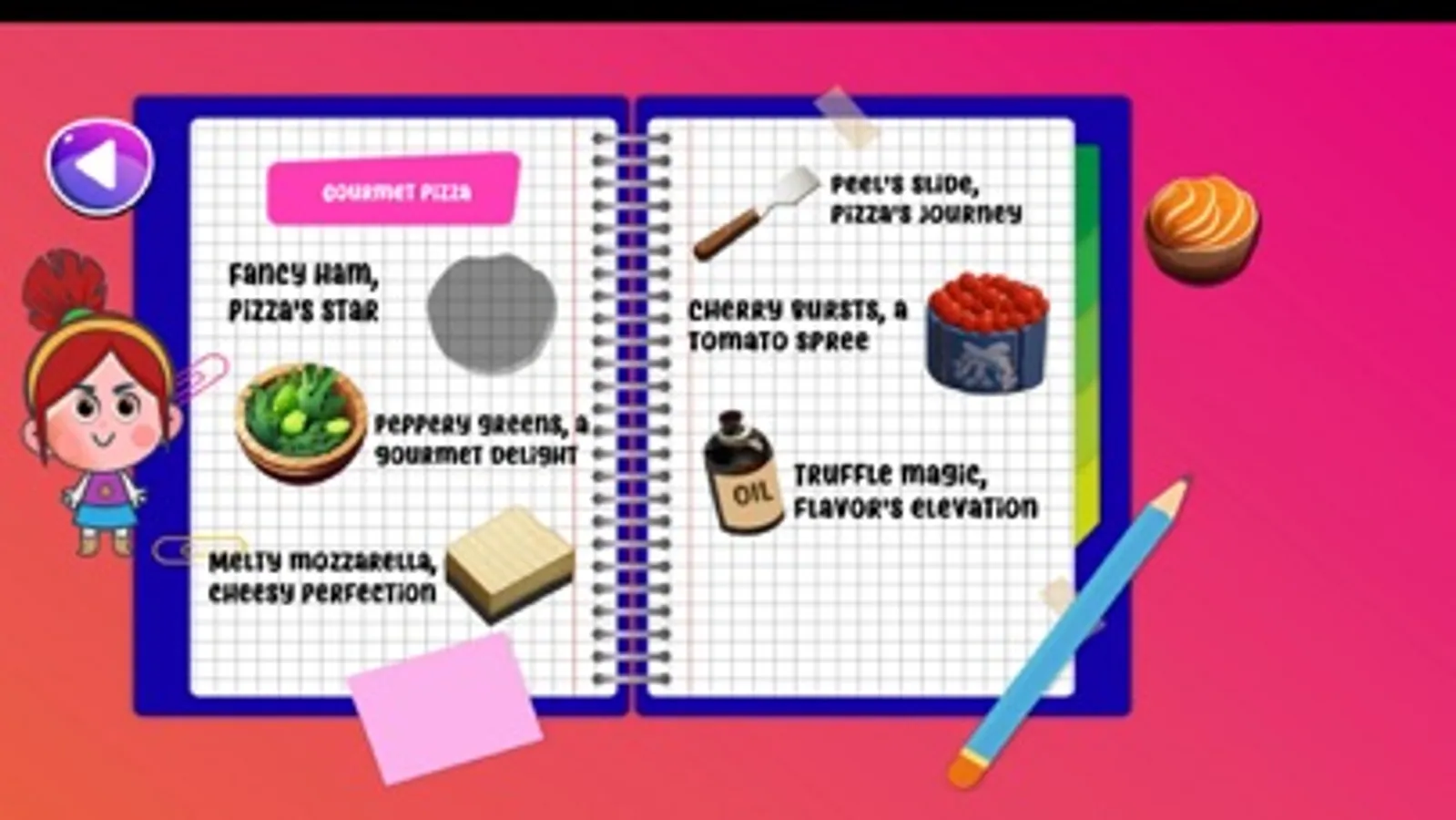 Step into an upscale pizza parlor with a brick oven and gourmet toppings. Your mission is to find prosciutto, arugula, mozzarella, truffle oil, pizza peel, and cherry tomatoes. Craft an exquisite gourmet pizza to unlock the next level.