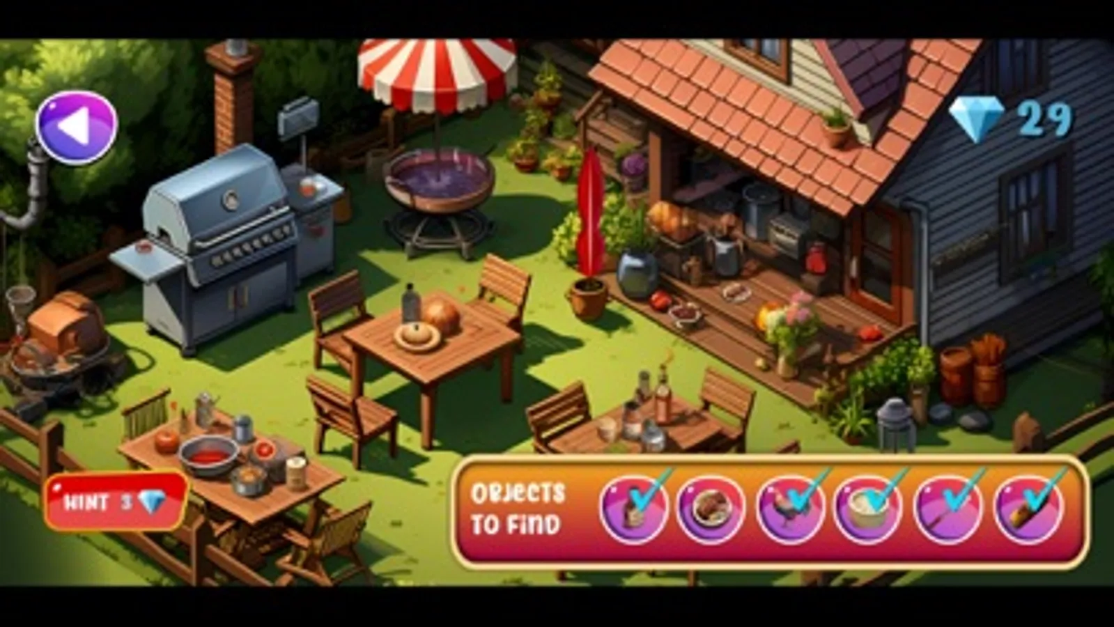 Join a backyard BBQ scene complete with grills, picnic tables, and summer decorations. Search for barbecue sauce, ribs, chicken, corn on the cob, coleslaw, and barbecue tongs. Host a sizzling BBQ feast to complete your culinary journey.