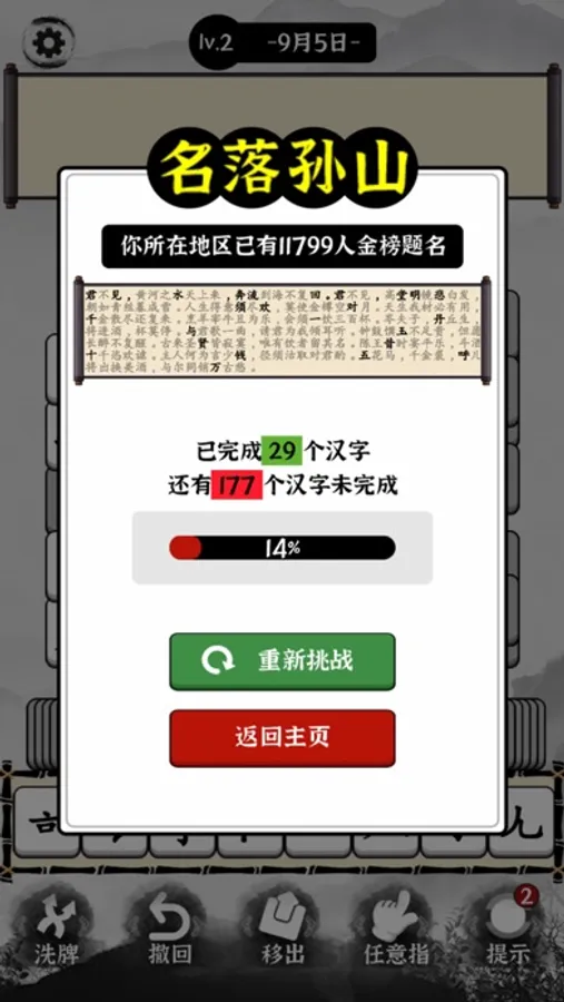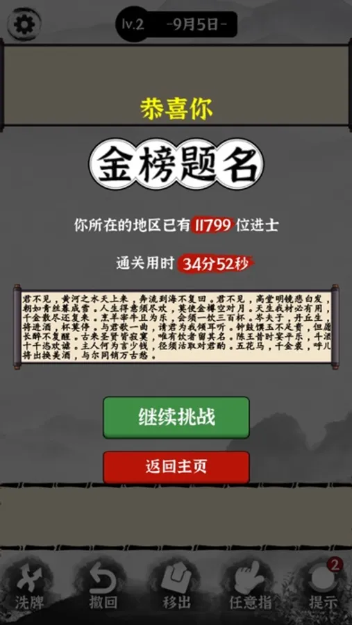 这是一款超烧脑的拼字游戏,玩家需要将拆分开的诗句文字拼到一起,考验的不仅仅是玩家的观察力和记忆力,更考验的是玩家的文化水平和对汉字的理解哦,李白的《将进酒》,还有大家都耳熟能详的《木兰辞》,你能完成它们吗?