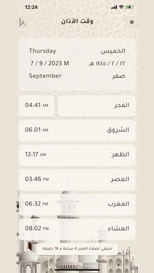 The app presents an accurate table of prayer times for the current day (and upcoming days soon). Prayer times are automatically updated daily based on the local time of the specified location. (The user can scroll through the days to view prayer times for upcoming days soon).