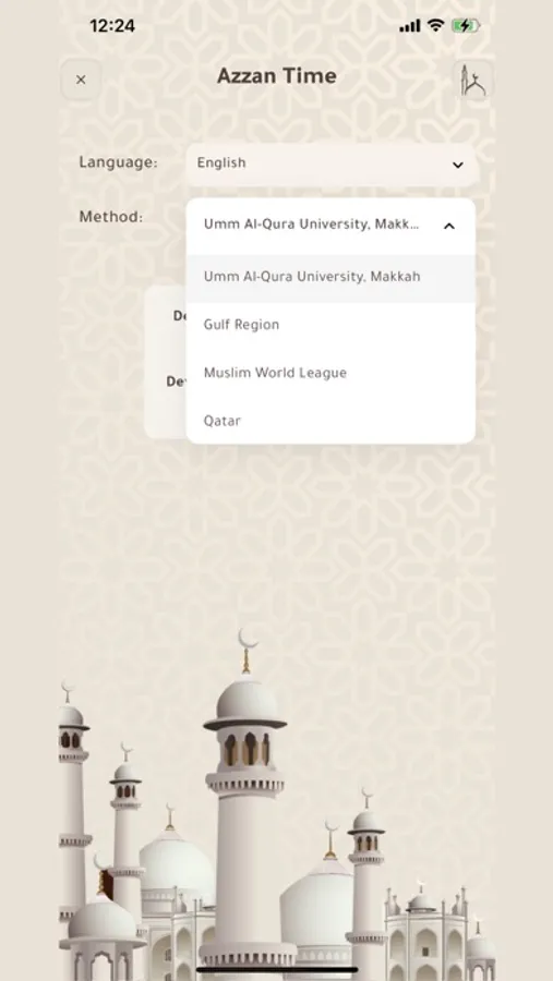 The app enables users to adjust various custom settings, change the Islamic method easily, and select their preferred language for the app."