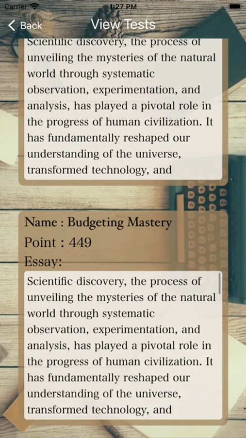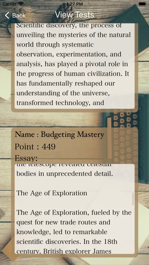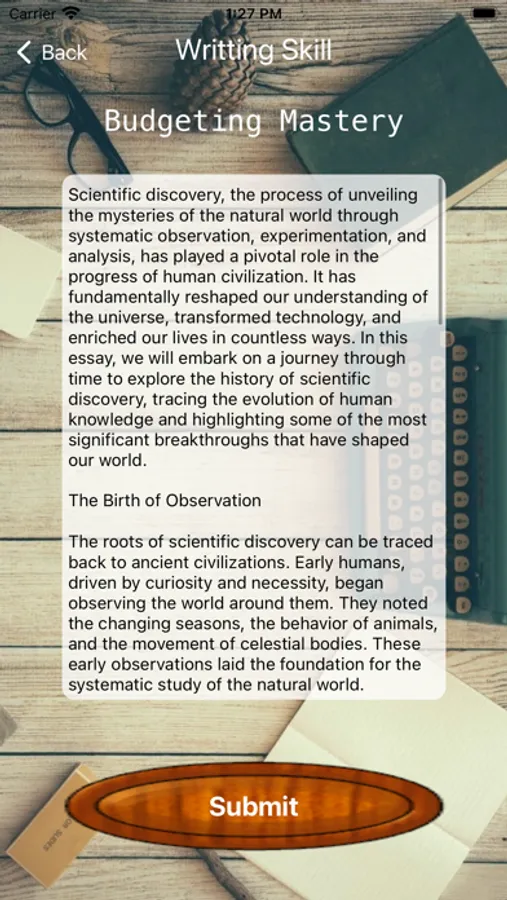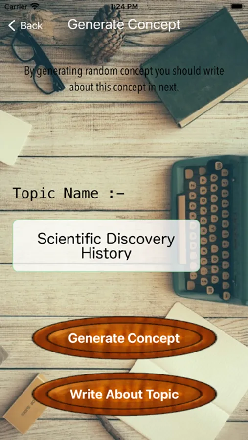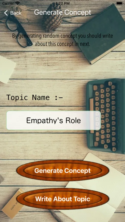 Welcome to “BommarangoWrite”, Here first we generate random topic by tap on generate Concept button before tap on write about topic button. After generate topic we are going on Writing Skill page on this page we should write Essay on topic which we get. When user submit this essay user get point for the writing skill. In the view test page user can see all previous test appeared by user. Thank you for downloading app. Please rate us on Appstore.