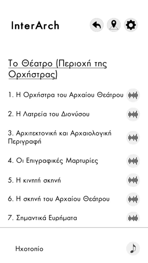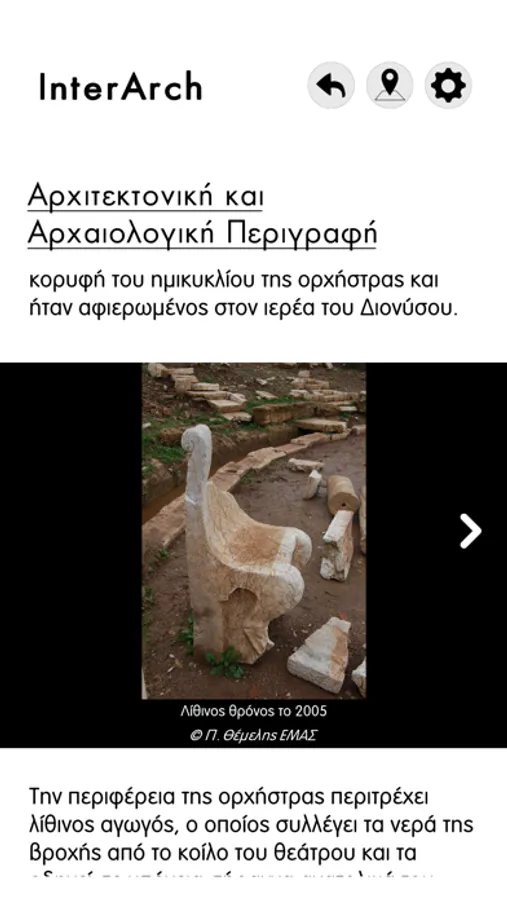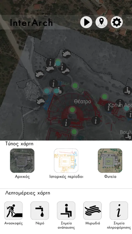 Το InterArch με βάση την ραγδαία ανάπτυξη της τεχνολογίας και την συστηματική της ενσωμάτωση στο χώρο του πολιτισμού τα τελευταία χρόνια επικεντρώνεται στην ανάπτυξη μίας εφαρμογής για iOS η οποία θα ανταποκρίνεται στις ανάγκες του σύγχρονου επισκέπτη, δίνοντας του τη δυνατότητα μίας προσωποποιημένης ξενάγησης η οποία θα εγείρει περισσότερες από μία αισθήσεις, κρατώντας τον πάντα συνδεδεμένο με το φυσικό περιβάλλον γύρω του.