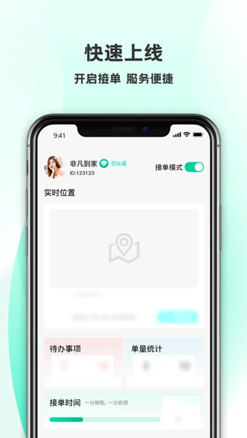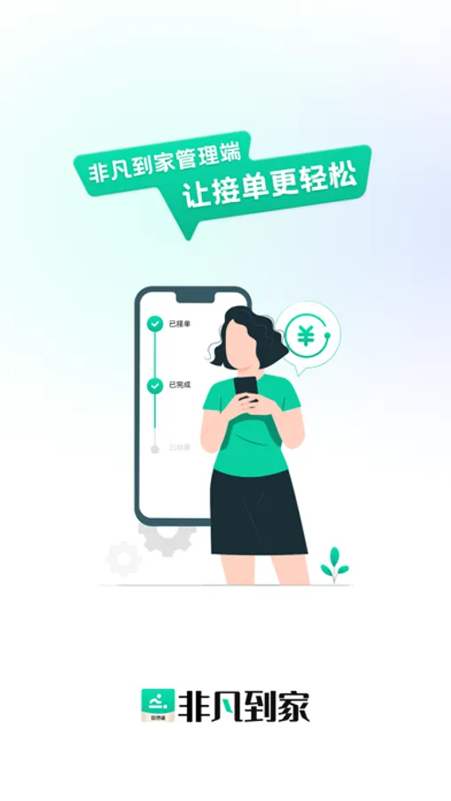 非凡到家管理端是非凡到家平台签约技师专属的工作台,可以方便每位技师便捷上线、开启接单、跟踪订单状态、查看收益等。界面美观、一目了然,包括登录、接单设置、订单管理、认证信息等功能,上手简单,帮助技师快速开启上线接单生活~
