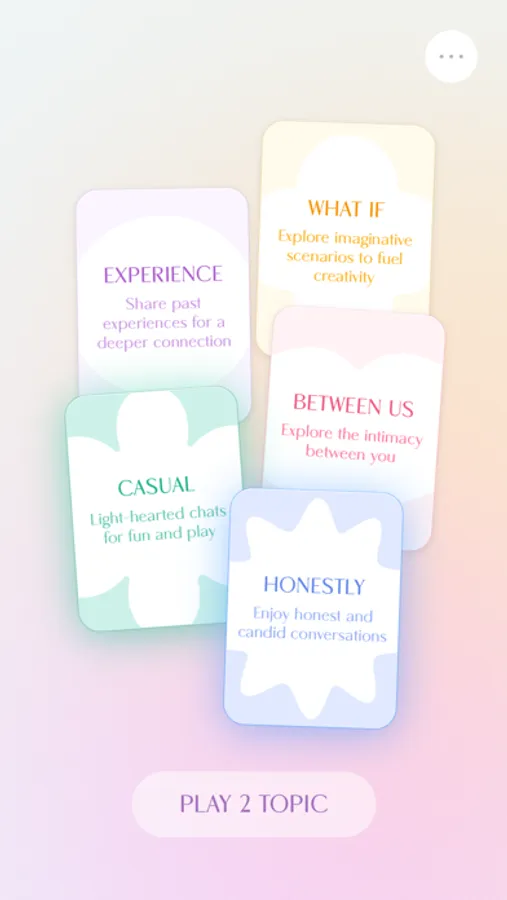 Choose Your Path: Pick from 5 categories (What If?, Between Us, Honestly, Casual, Experience) each bursting with around 30 thought-provoking questions.